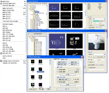 2D/3D/동적 블록 및 상용화 블록 등 약 2500여 개의 다양한 블록 라이브러리를 제공하고 이 블록들을 도면에 쉽게 추가할 수 있는 기능과 사용자 블록을 만들어 추가할 수 있는 기능을 제공한다.