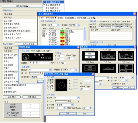 표준 레이어 관리/변환/검토 등의 표준화 도구와 시트/도면명/실명/평면/단면/입면/전개/창호/개정표시 등의 표준화 작성 기능을 제공하고 보다 편리한 적법성 검토 지원도구를 제공한다.
